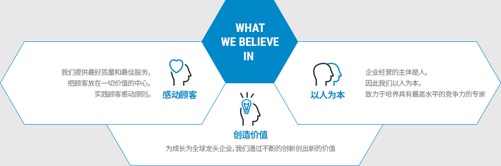 我们提供最好质量和最佳服务,把顾客放在一切价值的中心,实践顾客感动原则,以让顾客感到幸福。