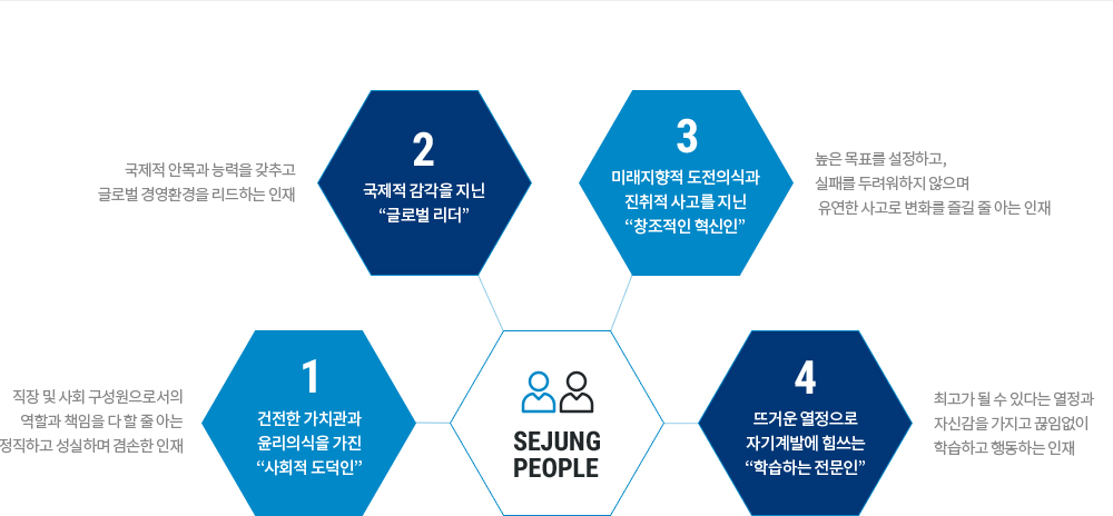 SJG 세정의 인재는 회사 창립 이후 이어져 내려오는 정신과 문화를 계승, 발전시키며 회사의 사훈인 창의, 성실, 화합을 실천하는 인재를 말합니다. SJG 세정의 인재관리의 핵심은 기업경영의 주체인 사람을 중시하며, 구성원 개개인의 가치와 잠재력을 소중히 여기고 최고의 역량을 발휘할 수 있도록 관리하고 지원합니다.
