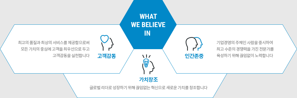 글로벌 지향 마인드를 함양하고 글로벌 고객 지향 마인드 함양 및 전략적인 글로벌 경영체계를 추구하여 세계 최고 수준의 제품과 서비스를 제공하고 진정한 글로벌 리더로 성장하겠습니다.